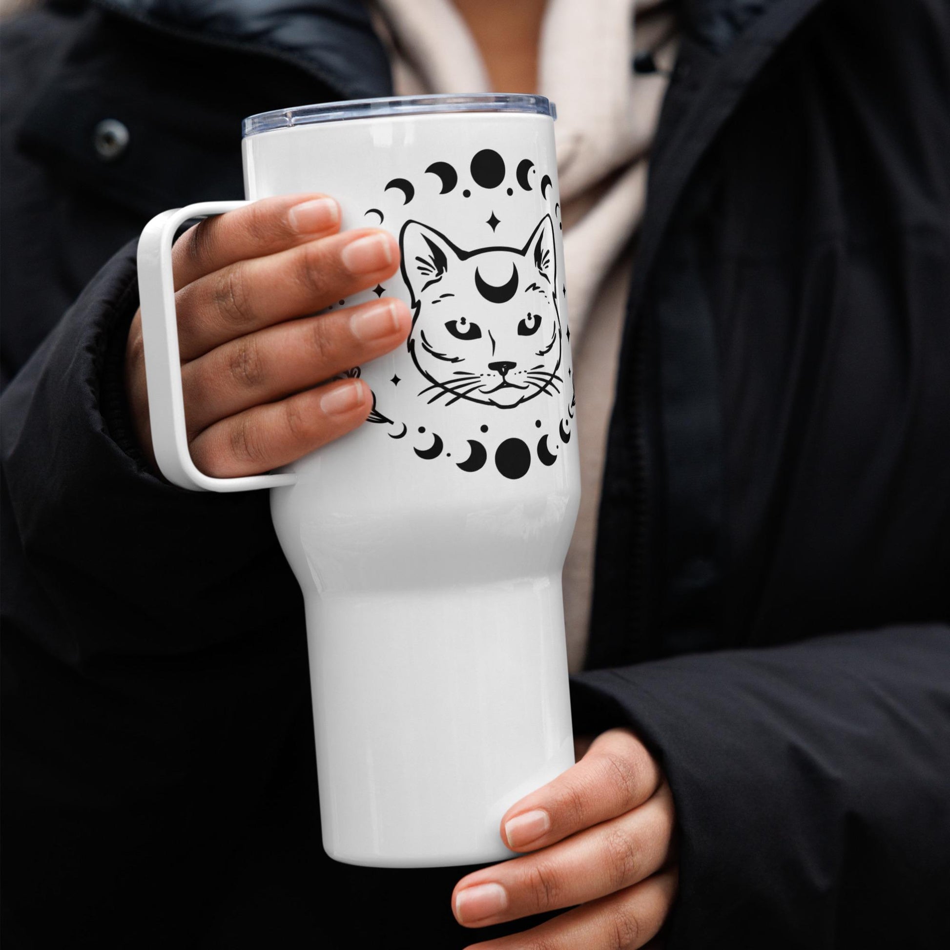 Taza de viaje con asa, diseño de gato celestial y luna, resistente, elegante y para uso diario, para café, agua y coche.