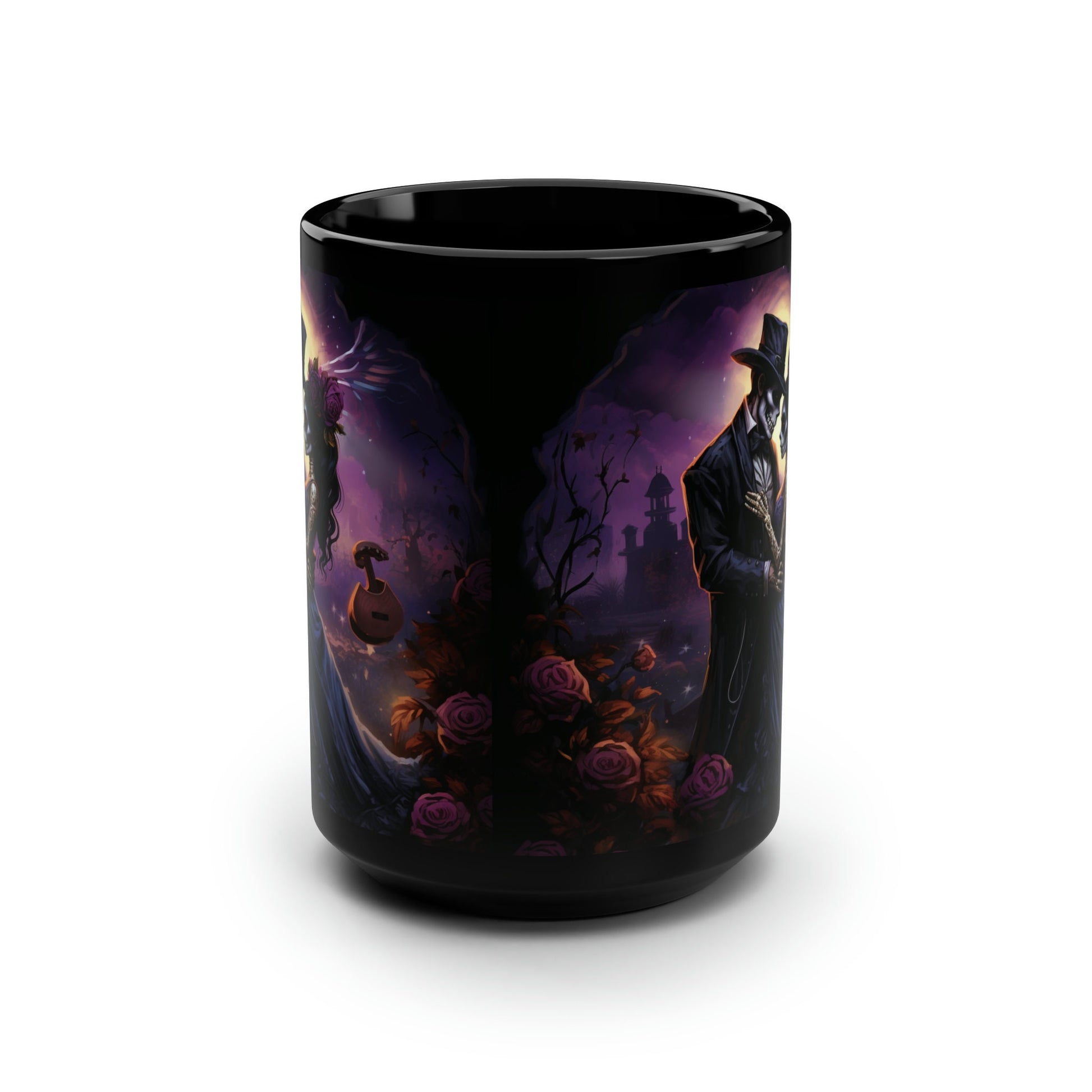 Black Mug, 15oz, Day of the Dead Dia de Los Muertos traditional couple print potrait Halloween season festive kitchen decor beverage cup