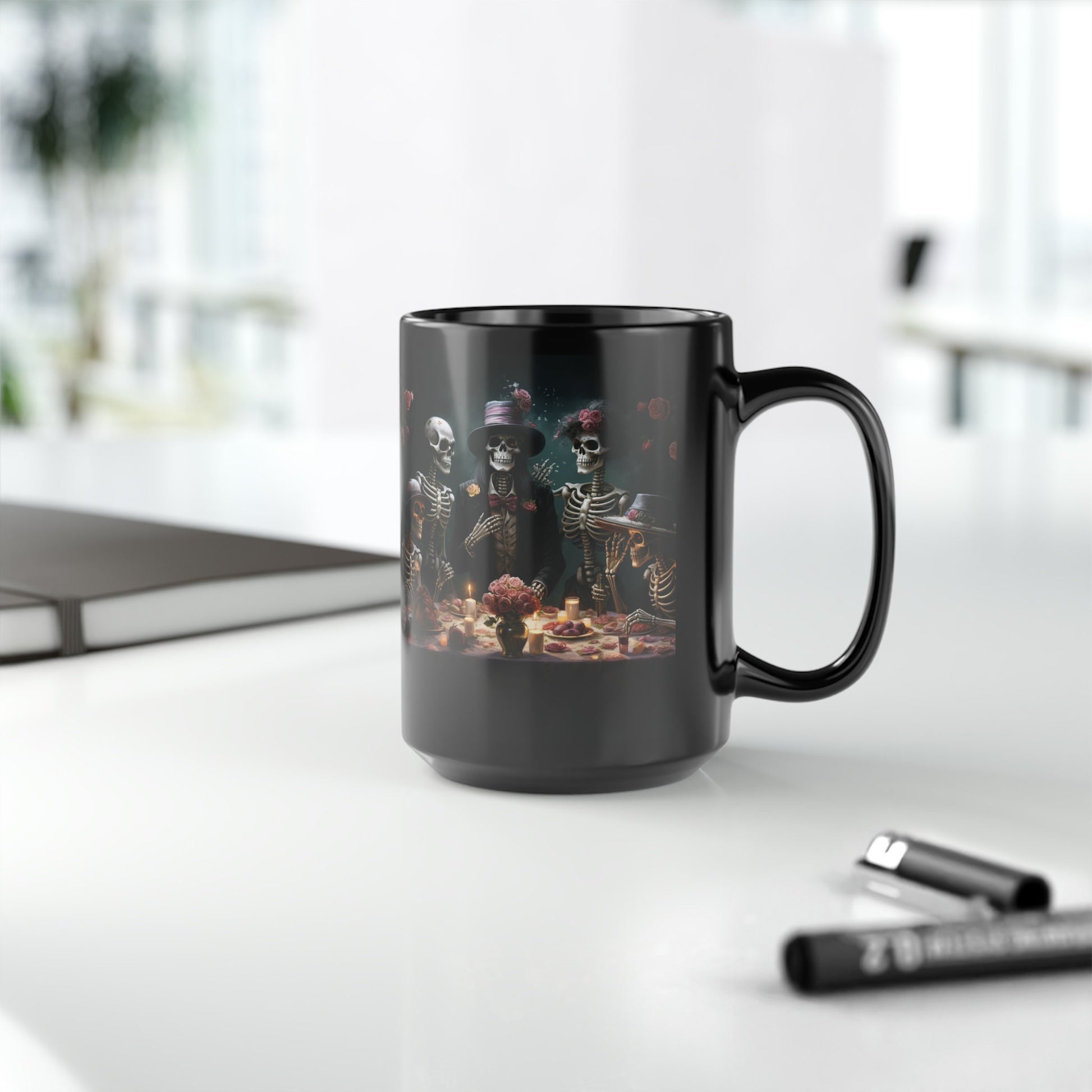 Black Mug, 15oz, Dia de Los Muertos Day Of the Dead Halloween festive family home single living traditional Mexican art kitchen beverage mug