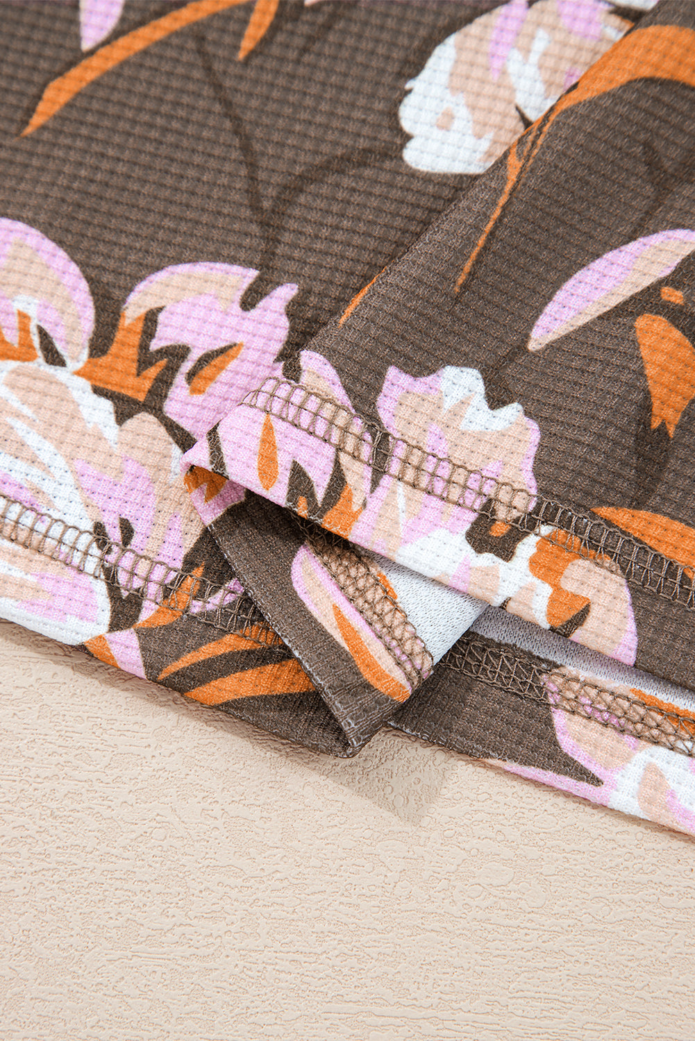 Brown Floral Print Waffle Textured Long Sleeve Top
