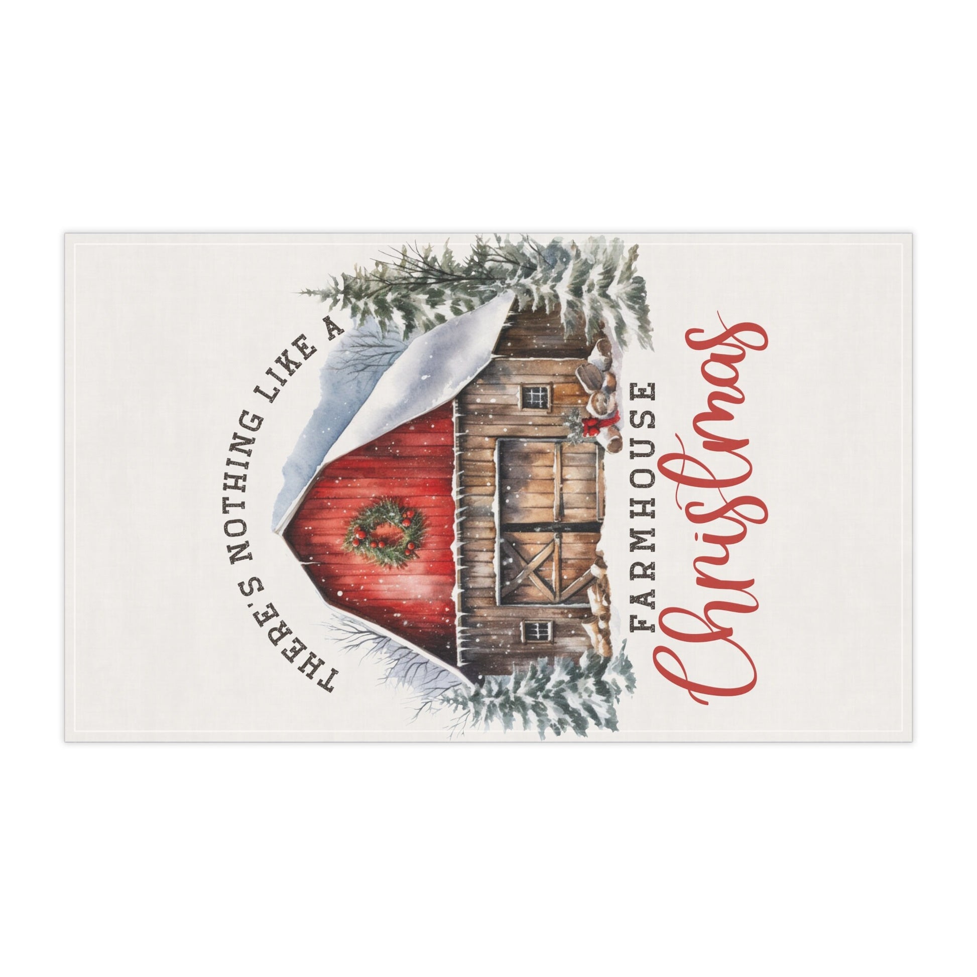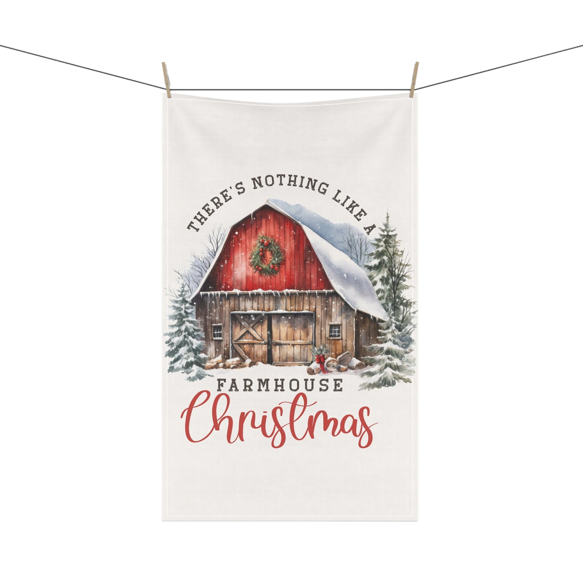 Farmhouse Xmas Kitchen Towel, great for hand drying, cooking, and xmas gifts. Adds a festive touch to your kitchen decor. Perfect for those who love holiday cooking and decorating during Christmas.