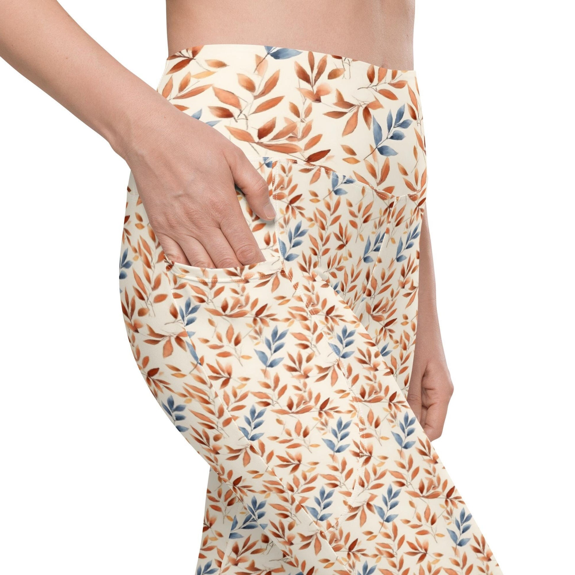 Leggings with pockets, Autumn leaves pattern Fall look stretchy yoga pilates gymn stylish everday sweater blazer pairing spandex pants