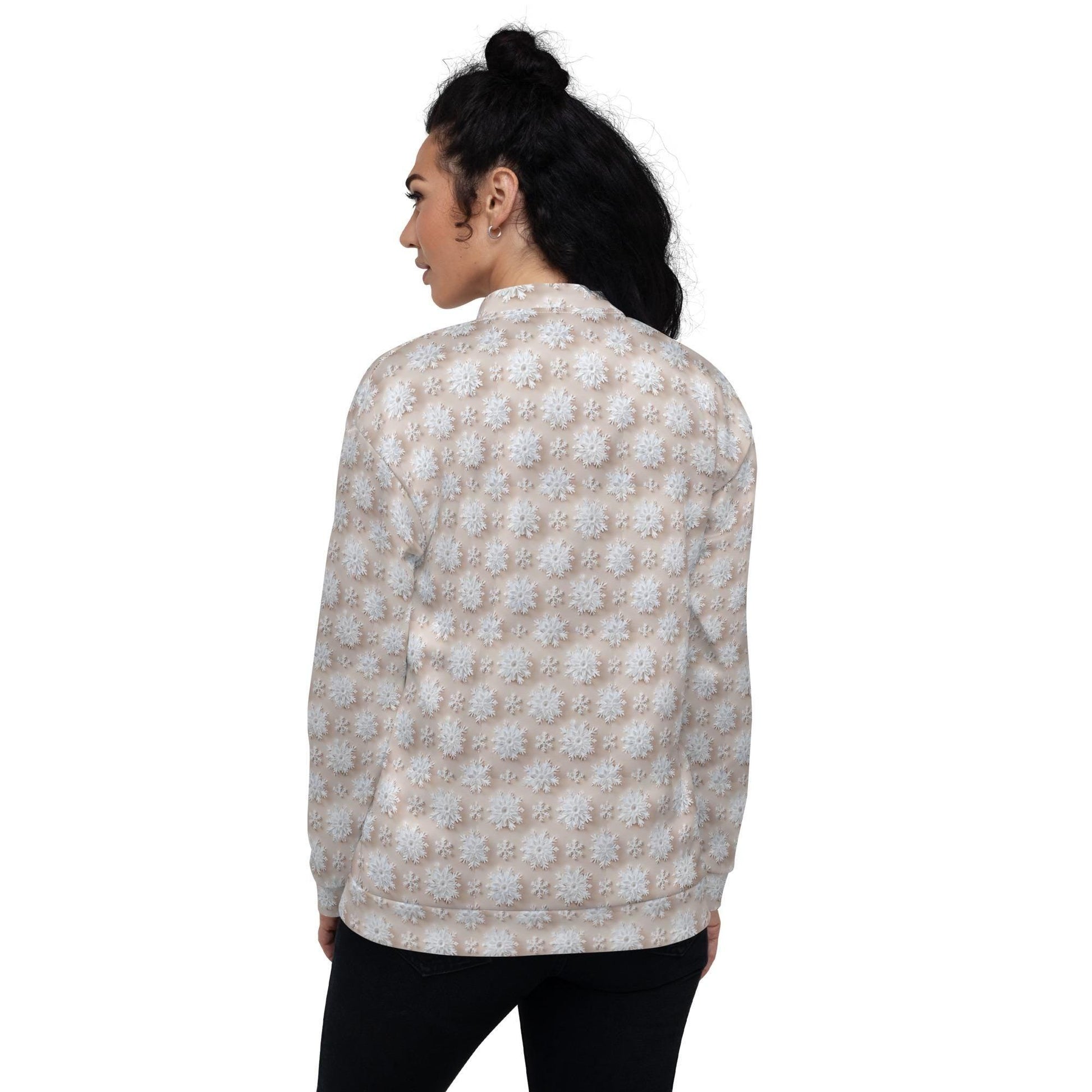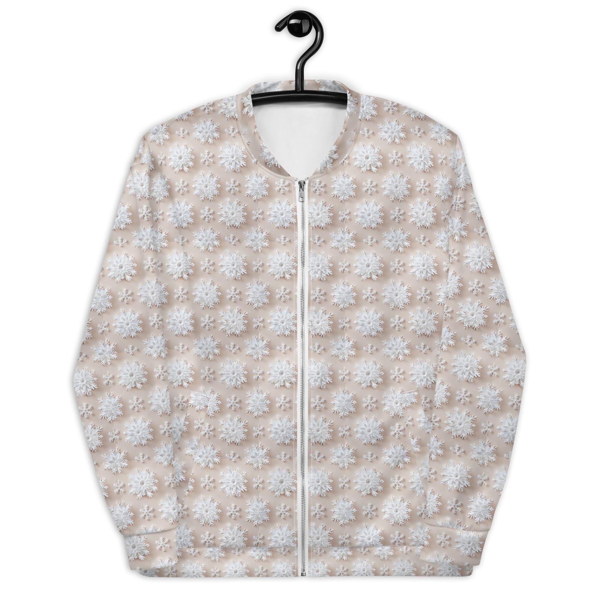 The crisp white base, adorned with delicate silver and gold snowflakes, makes this bomber jacket a perfect statement piece for holiday parties, winter celebrations, and Christmas festivities. Designed for the modern woman who loves to stand out, the bomber jacket offers a flattering fit with ribbed cuffs and a stylish zip closure. The soft lining ensures comfort while the eye-catching design adds sophistication to any winter outfit.