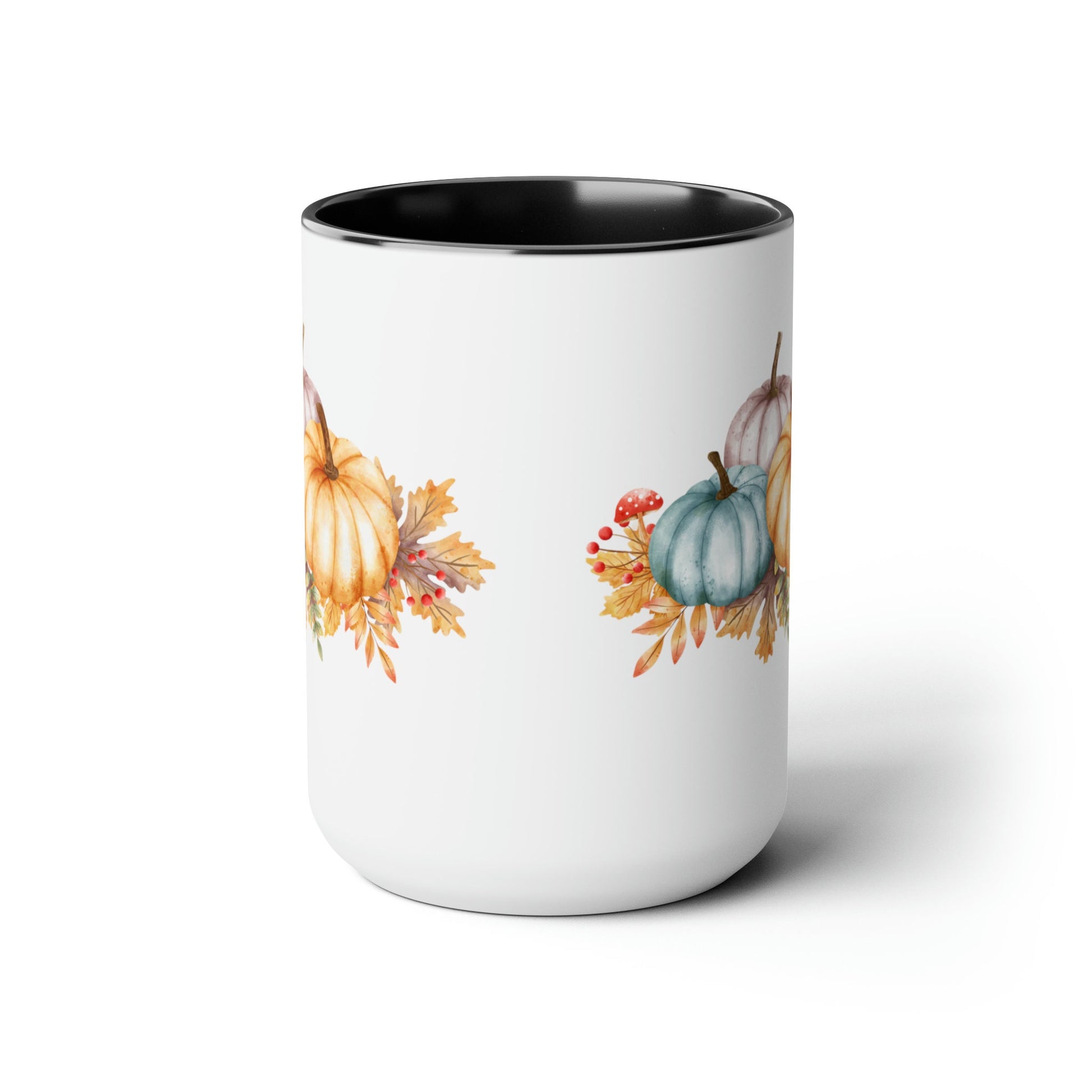 Two-Tone Coffee Mugs, 15oz, Fall November holiday colorful festive pumpkin design large coffee hot tea kitchen decor mug